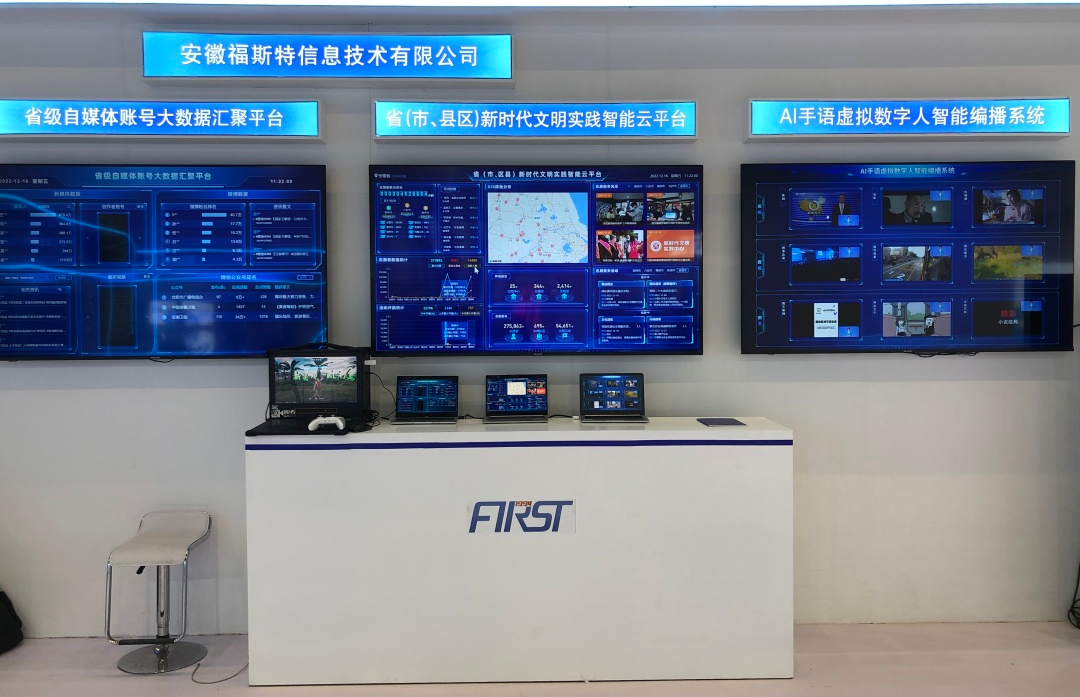 安徽福斯特信息技術有限公司此次應邀參展,以廣電媒體發展為亮點,集中展示大數據、人工智能,呈現了AI-VLOG視頻智能合成系統+AI手語虛擬數字人智能編播系統+省級自媒體賬號大數據匯聚平臺+?。ㄊ小⒖h區)新時代文明實踐智能云平臺技術。